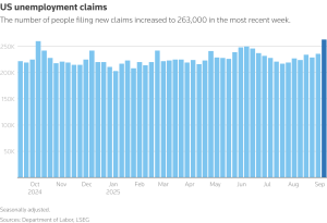 The labor market showed signs of strain. First-time claims for unemployment benefits rose 27,000 to a seasonally adjusted 263,000 last week, the highest level since October 2021. Analysts noted that spikes in states like Texas, possibly linked to July’s floods, may have contributed to the increase. Overall, the number of people receiving benefits after an initial week of aid remained unchanged at 1.939 million.